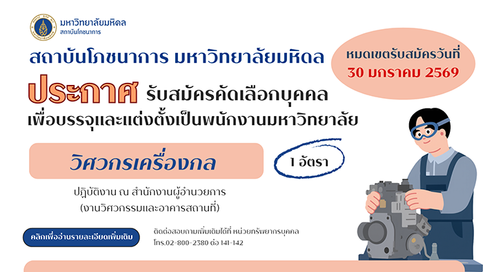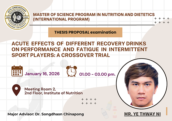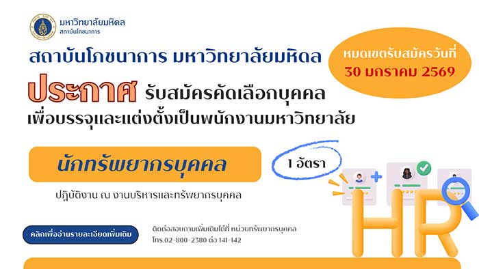 Home Announcements Ye-16-01-69Engineering15-1-69Job30-1-69Job30-1-6915_016_0Cong_Nilesh News Institute of Nutrition, Mahidol University Participates in MOU Signing Ceremony to Support Nutrition and Research for Individuals with Special Needs INMU Conducts Annual ISO/IEC 17025 Laboratory Standards INMU Rings in 2026 with Joy and Togetherness The Institute of Nutrition Joins the “Eat Well, Change Your Life” Campaign at the Healthier Choice Expo Read More Quick Links Thai Food Composition ASEANFOODS Thai School Lunch Job Opportunities Institute of Nutrition, Mahidol University.999 Phutthamonthon Sai 4 Road, Salaya,Phutthamonthon, Nakhon Pathom 73170, ThailandTel. +66 2 800 2380 Fax. +66 2 441 9344 Intranet | Web mail | News | Contact