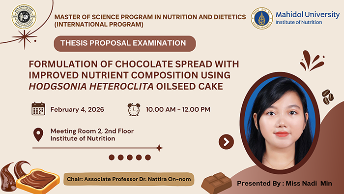 Home Announcements Nadi-Min-4-2-69Job5-2-69Job20-2-2569Job26-2-6915_016_0Cong_Nilesh News INMU Welcomes Mahasarakham University for Nutrition Study Visit Institute of Nutrition, Mahidol University Welcomes 2025 Prince Mahidol Award Laureate Dr. Walter Willett for Academic Visit and Collaboration Institute of Nutrition, Mahidol University, Celebrates Its 49th Anniversary Read More Quick Links Thai Food Composition ASEANFOODS Thai School Lunch Job Opportunities Institute of Nutrition, Mahidol University.999 Phutthamonthon Sai 4 Road, Salaya,Phutthamonthon, Nakhon Pathom 73170, ThailandTel. +66 2 800 2380 Fax. +66 2 441 9344 Intranet | Web mail | News | Contact