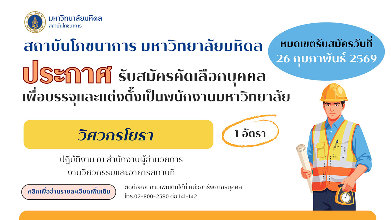วันที่ 23 ม.ค. 2569 เนื่องในโอกาสครบรอบ 49 ปี วันสถาปนาสถาบันโภชนาการ มหาวิทยาลัยมหิดล ได้จัดพิธีทำบุญเพื่อความเป็นสิริมงคลและพิธีมอบรางวัลบุคลากรดีเด่นและอาจารย์ตัวอย่าง ประจำปี พ.ศ. 2568 เพื่อยกย่องและสร้างขวัญกำลังใจแก่บุคลากรซึ่งเป็นพลังสำคัญในการขับเคลื่อนองค์กร ณ ห้องประชุมอารีวัลยะเสวี