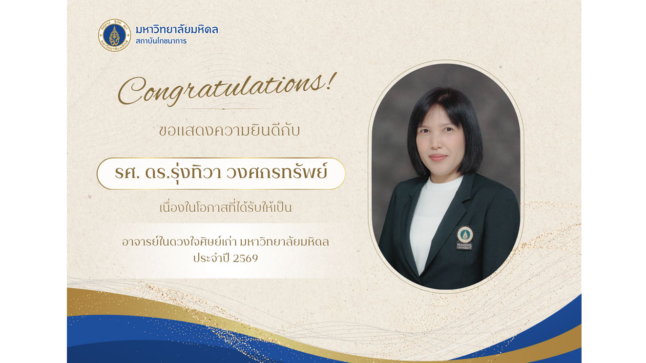 วันที่ 31 มี.ค. 2569 รศ.ดร.ชลัท ศานติวรางคณา ผู้อำนวยการสถาบันโภชนาการ มหาวิทยาลัยมหิดล พร้อมด้วย รศ.ภก.สุรกิจ นาฑีสุวรรณ คณบดีคณะเภสัชศาสตร์ มหาวิทยาลัยมหิดล ได้รับเกียรติร่วมเวทีเสวนาในหัวข้อ "Future Food: นวัตกรรมอาหารเพื่อเศรษฐกิจมูลค่าสูง"