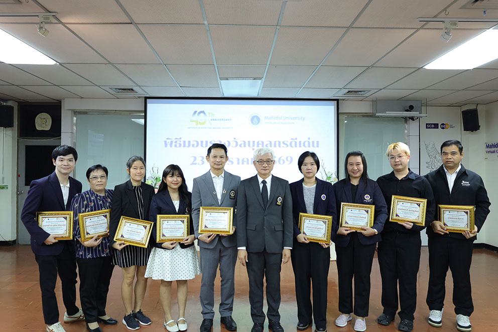 วันที่ 23 มกราคม 2569 เนื่องในโอกาสครบรอบ 49 ปี วันสถาปนาสถาบันโภชนาการ มหาวิทยาลัยมหิดล ได้จัดพิธีทำบุญเพื่อความเป็นสิริมงคลและพิธีมอบรางวัลบุคลากรดีเด่นและอาจารย์ตัวอย่าง ประจำปี พ.ศ. 2568 เพื่อยกย่องและสร้างขวัญกำลังใจแก่บุคลากรซึ่งเป็นพลังสำคัญในการขับเคลื่อนองค์กร ณ ห้องประชุมอารีวัลยะเสวี