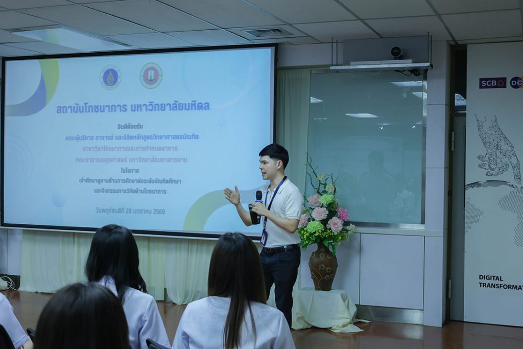 วันที่ 29 มกราคม 2569 สถาบันโภชนาการ มหาวิทยาลัยมหิดล ให้การต้อนรับคณะศึกษาดูงานจากหลักสูตรวิทยาศาสตรบัณฑิต สาขาวิชาโภชนาการและการกำหนดอาหาร คณะสาธารณสุขศาสตร์ มหาวิทยาลัยมหาสารคาม พร้อมคณาจารย์ประจำหลักสูตร ณ ห้องประชุมอารี วัลยะเสวี สถาบันโภชนาการ มหาวิทยาลัยมหิดล เพื่อเปิดโอกาสให้นิสิตได้เรียนรู้บทบาท ภารกิจ และงานวิจัยของสถาบันโภชนาการ รวมถึงแนวทางการศึกษาต่อในระดับบัณฑิตศึกษา